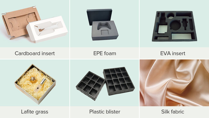 We offer a wide range of inner packaging inserts for your customization, including paper inserts, EPE foam, blister inserts, raffia grass, EVA foam etc, ensuring tailored solutions to meet your product-specific needs across diverse application scenarios.