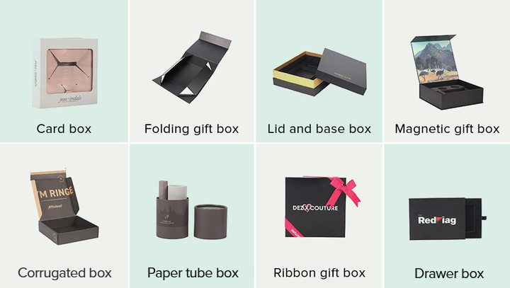 We can customize personalized box types based on the product requirements of different clients. The box types we commonly make include Ribbon gift box, Drawer box, Magnetic gift box, Lid and base box, Corrugated box, Card box and Paper tube box.